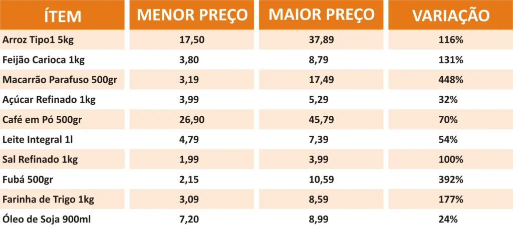 A principal diferença foi no macarrão, no caso, foi utilizado como comparativo o pacote do tipo parafuso de 500 gramas. O menor preço encontrado foi de R$ 3,19, enquanto o maior preço foi de R$ 17,49, uma variação de 448%.