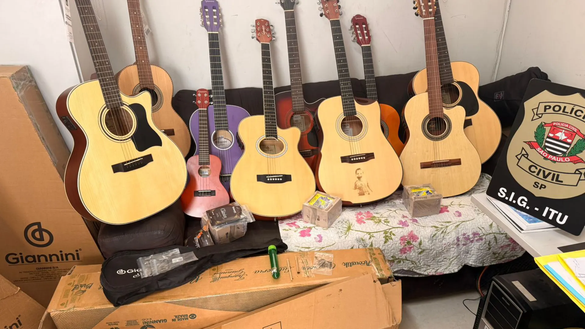 Diversos violões, violas e um ukulele, além de insumos como caixas de instrumentos e embalagens de cordas, foram apreendidos. A maioria dos itens foi localizada na residência do acusado. Um aparelho celular e porções de maconha também foram encontrados.