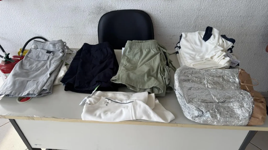Diversas peças de roupas foram encontradas no carro, além de uma bolsa utilizada na ação criminosa. Um representante da loja foi acionado para o reconhecimento dos itens.