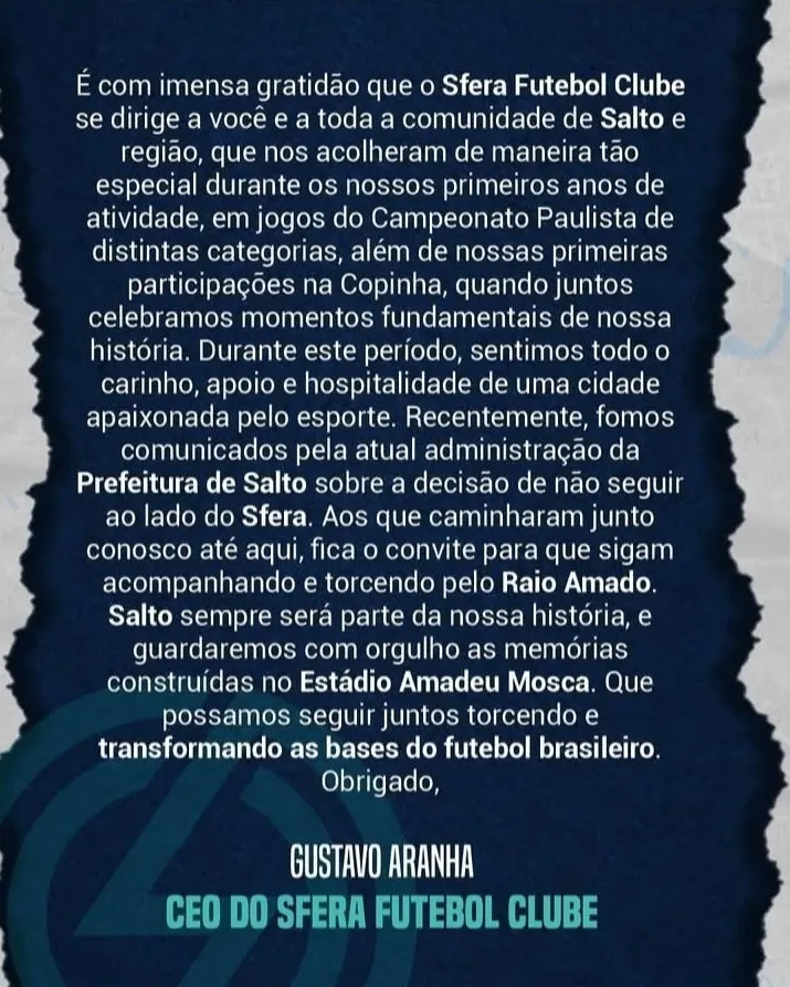 Uma notícia que vai impactar no futebol saltense. Na tarde de terça-feira (2), o Sfera Futebol Clube emitiu um comunicado informando que deixará a cidade de Salto, a qual representa oficialmente nas competições de futebol de base. A decisão se deu após a Prefeitura de Salto decidir não dar continuidade à parceria.